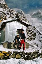 Zvova ledovec Dome. Dole jsou střechy kadibudek, kde je krásně vidět kolik napadlo nového sněhu.