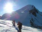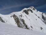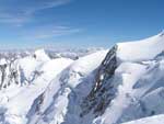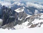 Na prvním hřebínku od spoda je chata Gonella. Vlevo opět Aiguill de Tre la Tete 3930 m vpravo vzádu je hřebínek Domes de Miage.
