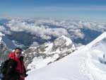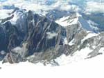Mont Blanc je po pravé ruce a není vidět, ale jsou vidět zleva Bernské Alpy a trojka Jungfrau, Mnich a Eiger. Dále jsou vidět Walliské alpy.